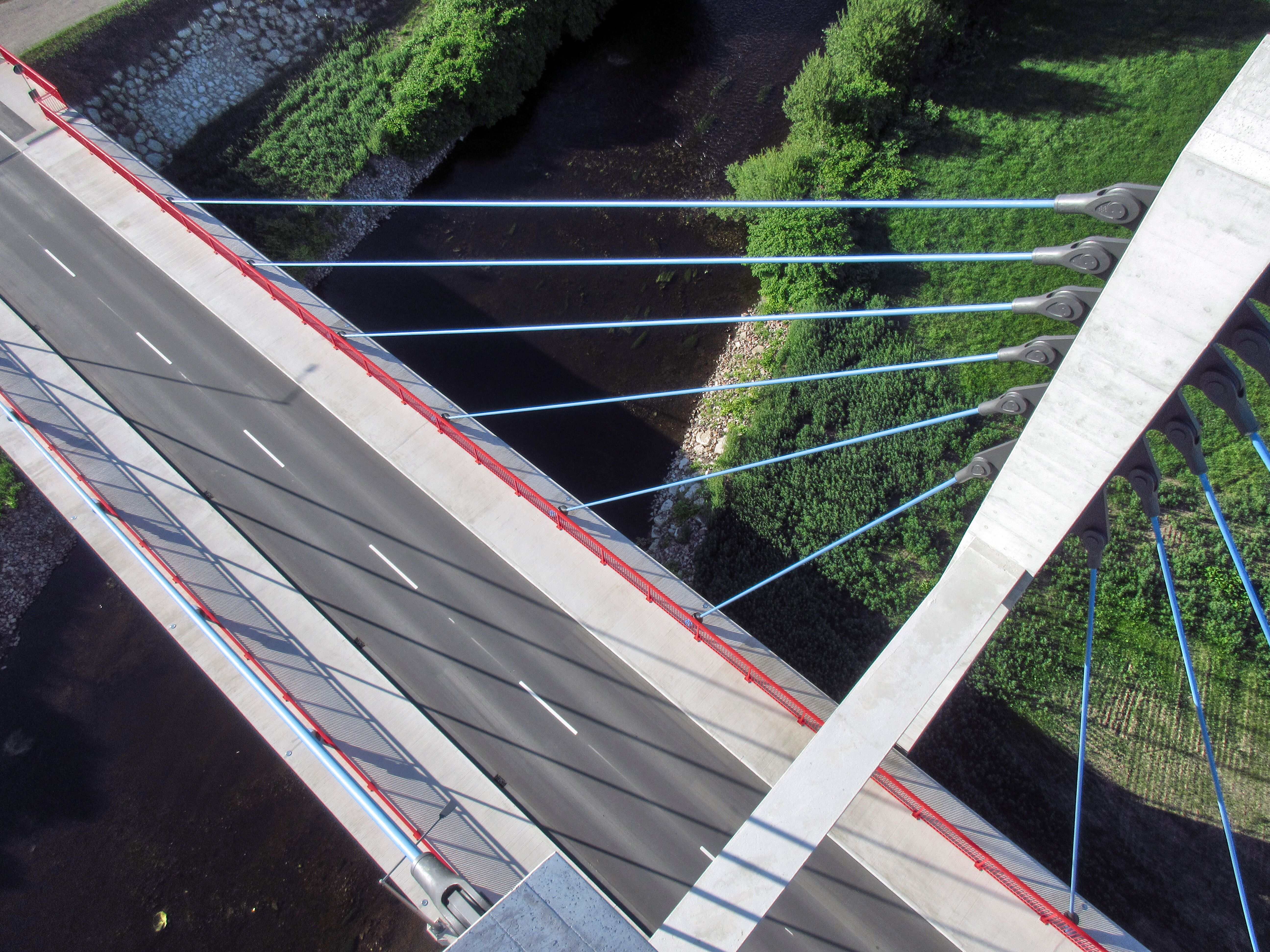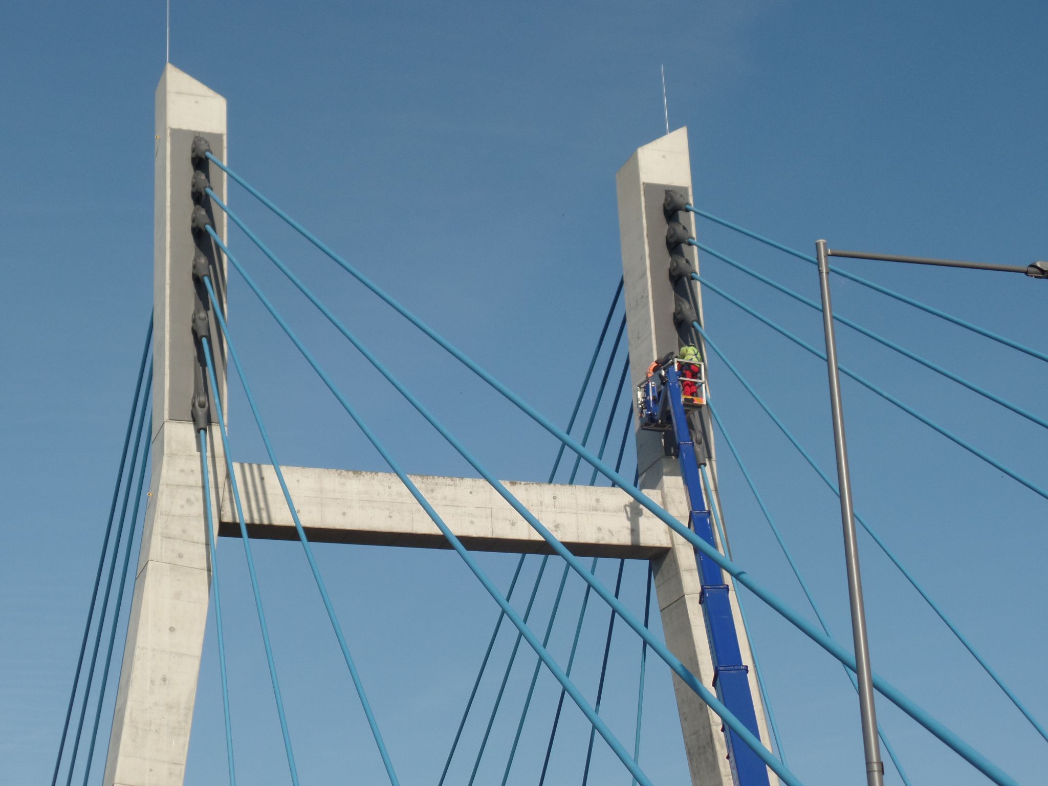In den vergangenen Tagen fand durch unsere Ingenieure die umfangreiche Bauwerksprüfung der Schrägseilbrücke über die Mulde bei Schlunzig statt. Besonderes Highlight war die handnahe Prüfung der Seile und des Pylons in rund 30 m Höhe.