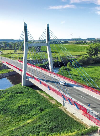 Das ebenfalls vom Ingenieurbüro Schulze+Rank geplante und während der Bauzeit begleitete Bauwerk ist eine 2-Feld-Schrägseilbrücke mit einer Gesamtlänge von 90 m ...